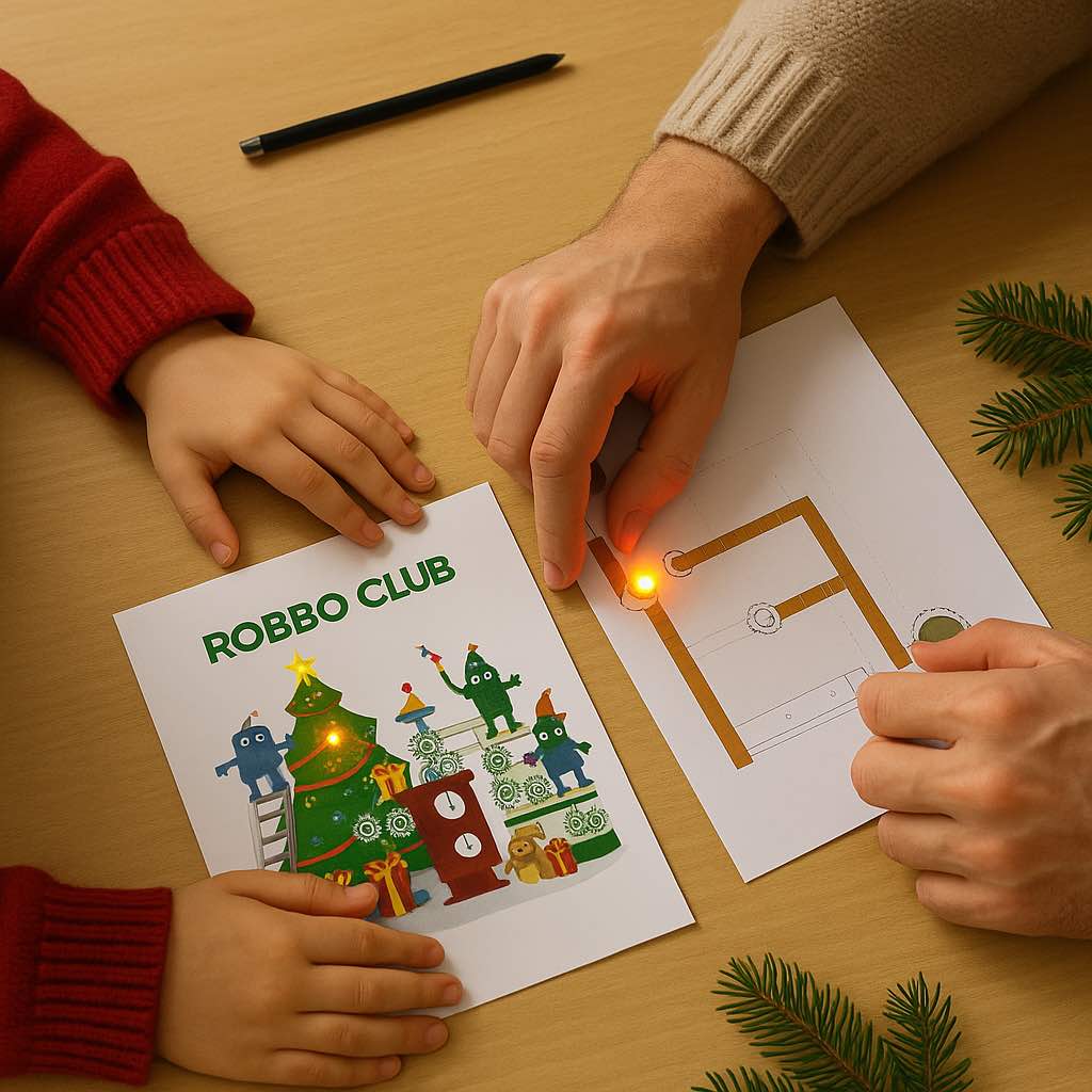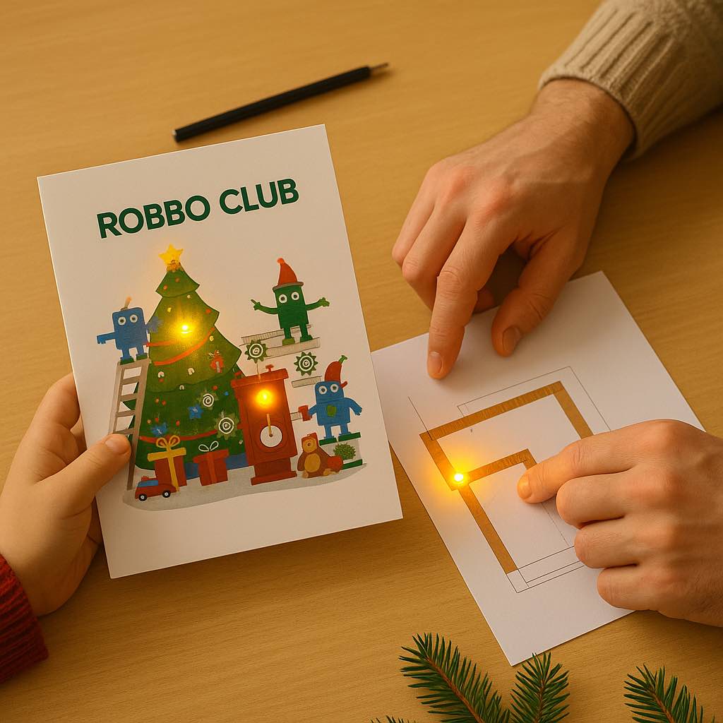 Weihnachtskarten-Workshop für Kinder im Alter von 5-10 Jahren: Lerne, wie du mit LED-Lichtern und einfacher Schematik deine eigenen leuchtenden Weihnachtskarten entwerfen und gestalten kannst.